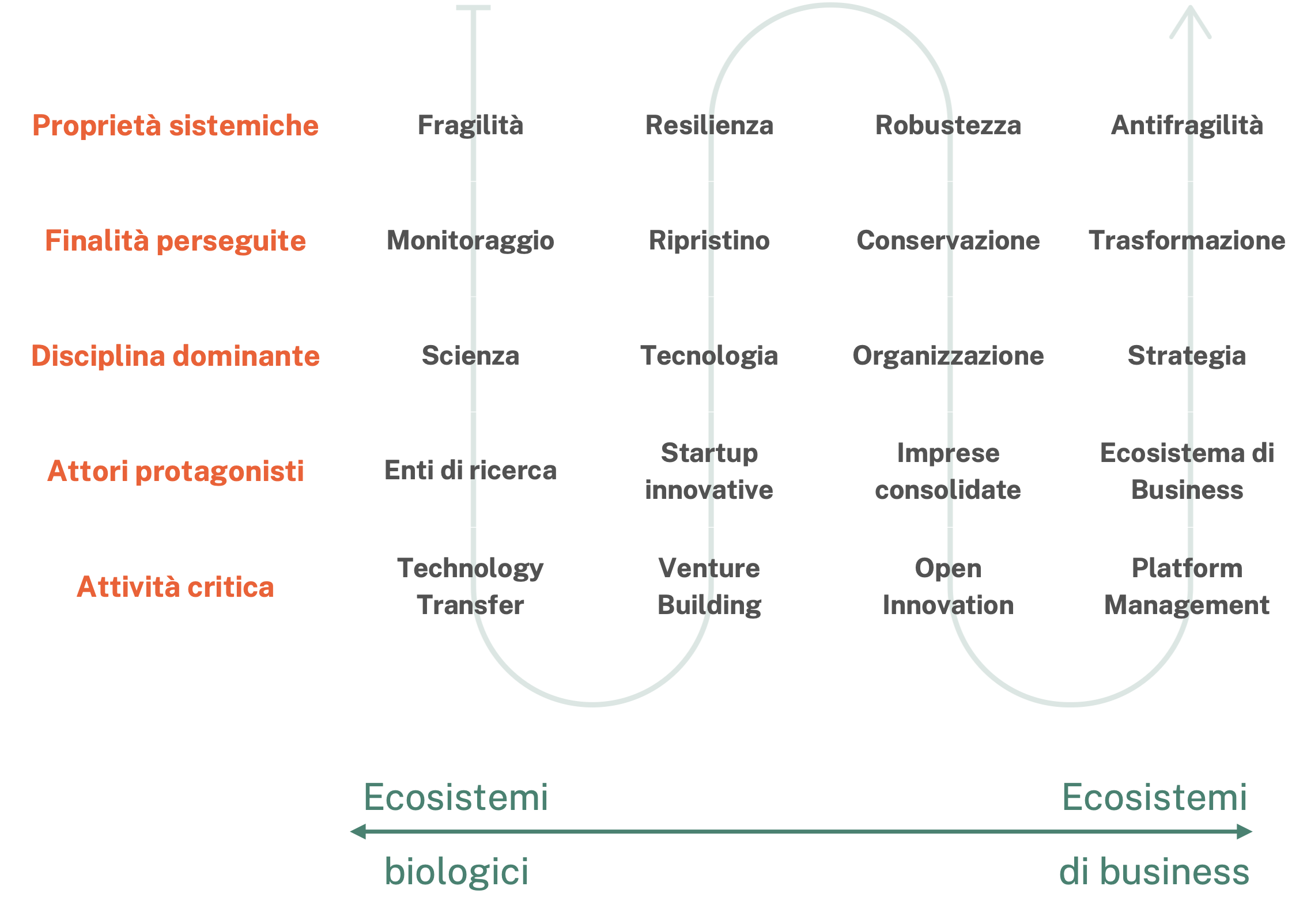 Il punto di arrivo è la creazione di ecosistemi di business la cui forza, al pari degli ecosistemi biologici, risiede nella diversità e ricchezza delle connessioni tra imprese consolidate, sia keystone che di nicchia, startup innovative ed enti di ricerca.